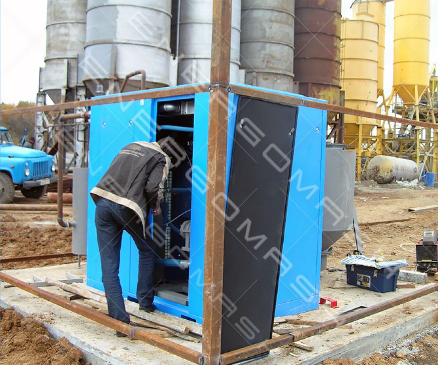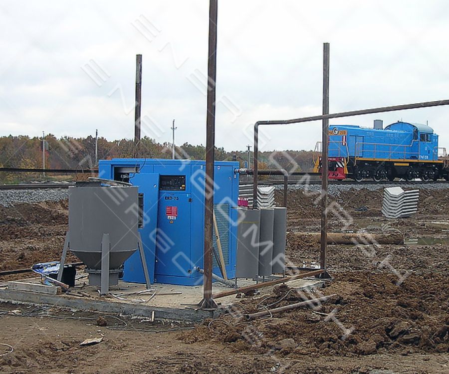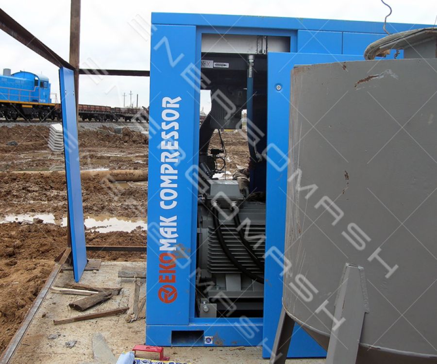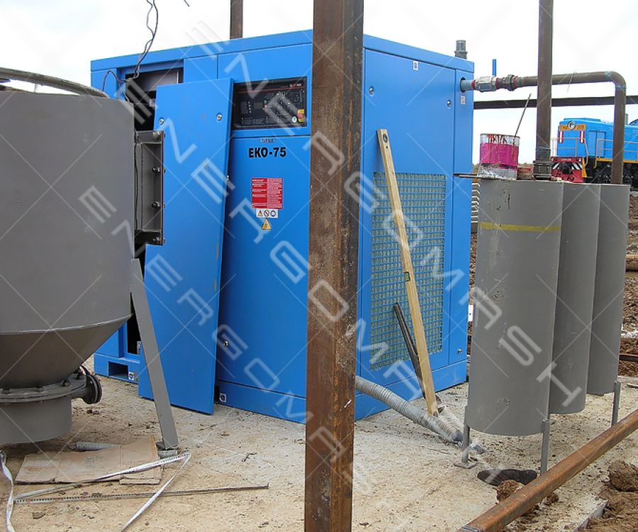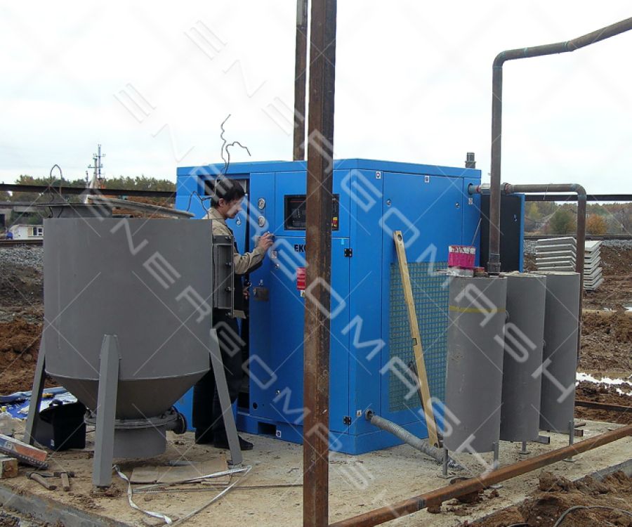 Для оперативного забезпечення бетоном будівництва птахофабрики “Вінницький бройлер” було потрібне швидке зведення розчино-бетонного вузла та вузла приймання цементу з вагона-хоперу. Для розвантаження вагонів та подальшого транспортування цементу силосами було вирішено використовувати пневмотранспорт, на базі пневмокамерних насосів. Виробництво стиснутого повітря для роботи пневмокамерних насосів здійснювалося за допомогою гвинтових повітряних компресорів компанії Екомак – Atlas Copco, серії Eko.