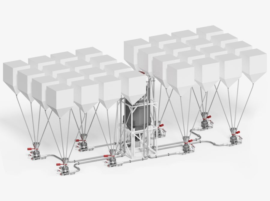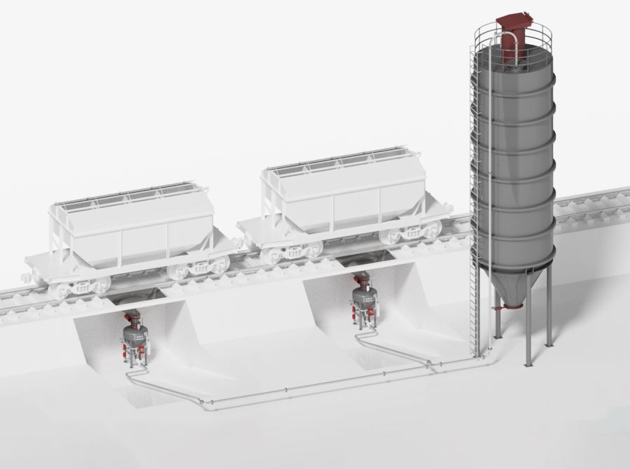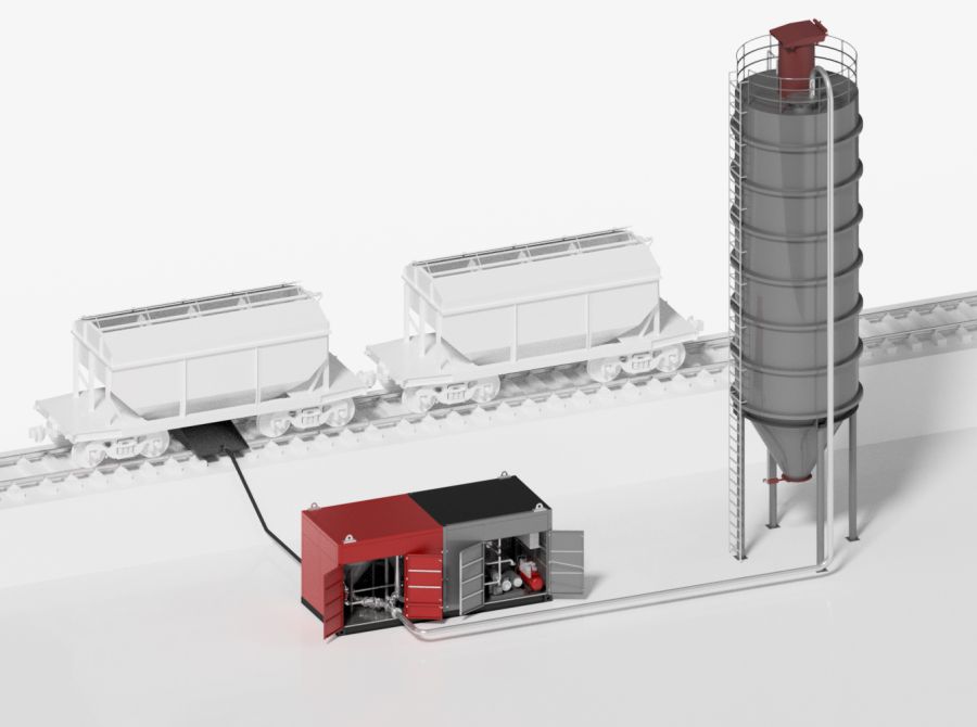 Для розвантаження вагонів із сухими сипучими матеріалами, найбільш ефективним та надійним рішенням є використання системи пневмотранспорту – на базі пневмокамерних насосів. Основною перевагою даної системи є відсутність механічних складових, що значно зменшує вартість обладнання та підвищує надійність системи загалом. Пневматична система перевантаження сипучих матеріалів має високий ступінь герметичності, завдяки чому значно знижується запиленість території.